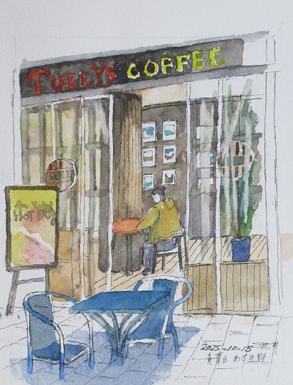いつも飲みに行くコーヒ屋の店前です。この店にかかるオーニング越しに大通りが描ければよいのですが。