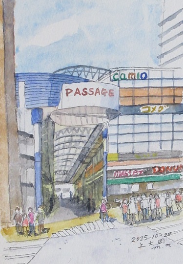 例年9月には寺家ふるさとの稲刈り風景を描いてきましたが、今年はうっかりして忘れてしまいました。上大岡の駅前のアーケードの商店街を描いてみました。