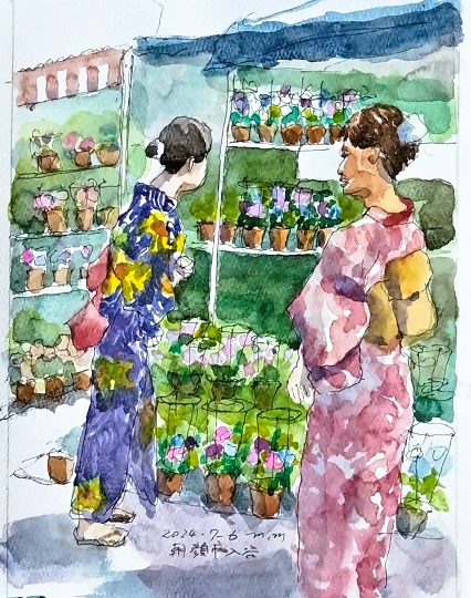 今年も出かけました。いつもは炎天下で描いてきましたが、今年は写真から家で描きました。この絵の女性を最初は見物の客と思っていましたが、売り子でした。 -